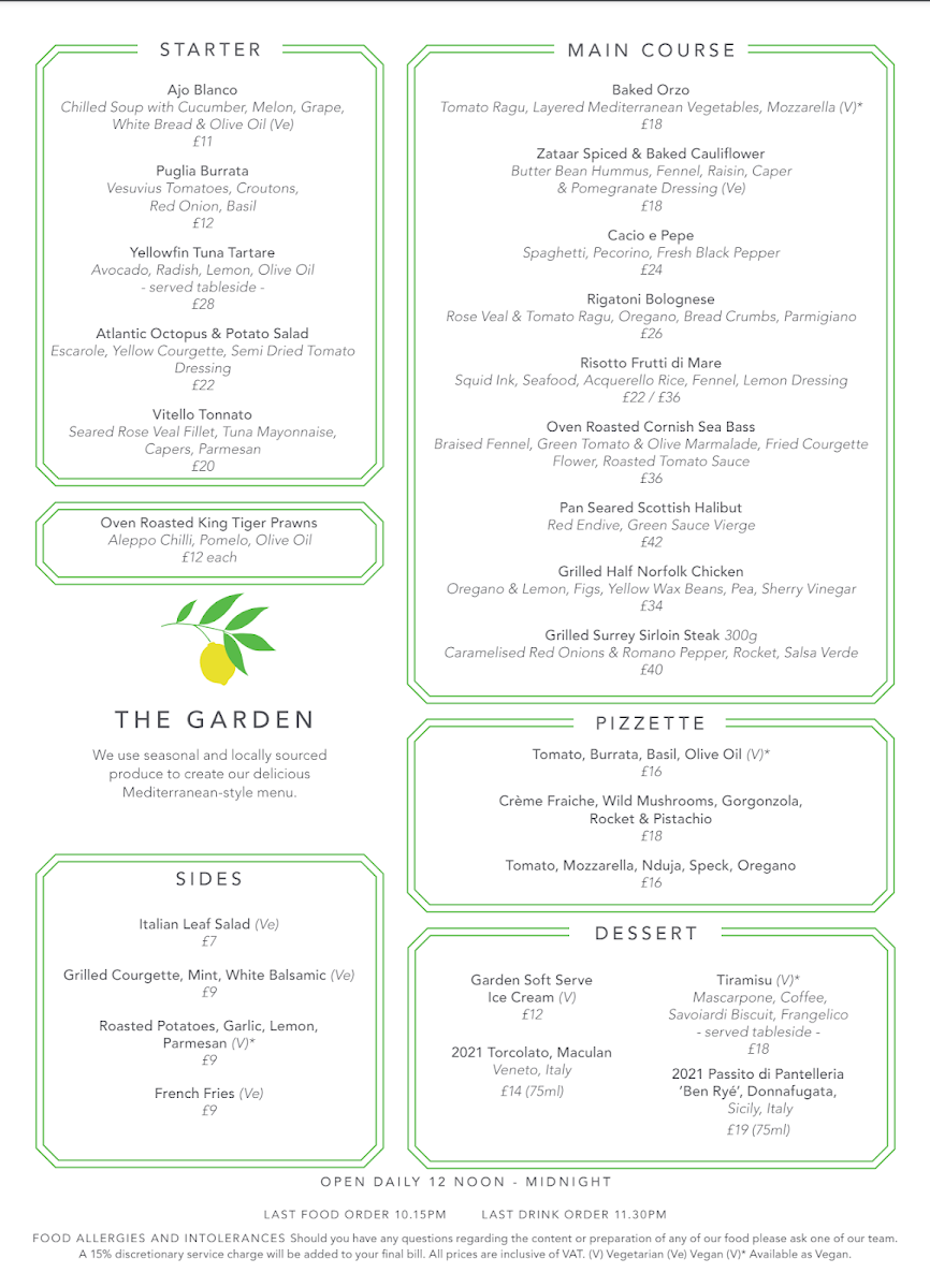 The Garden Menu, located at 10a Northumberland Ave, London SW1A 2BD, offers a delightful dining experience with a variety of high-quality dishes that cater to diverse tastes. As a spot that blends casual dining with refined flavors, it stands out for its elegant ambiance and attention to culinary detail.